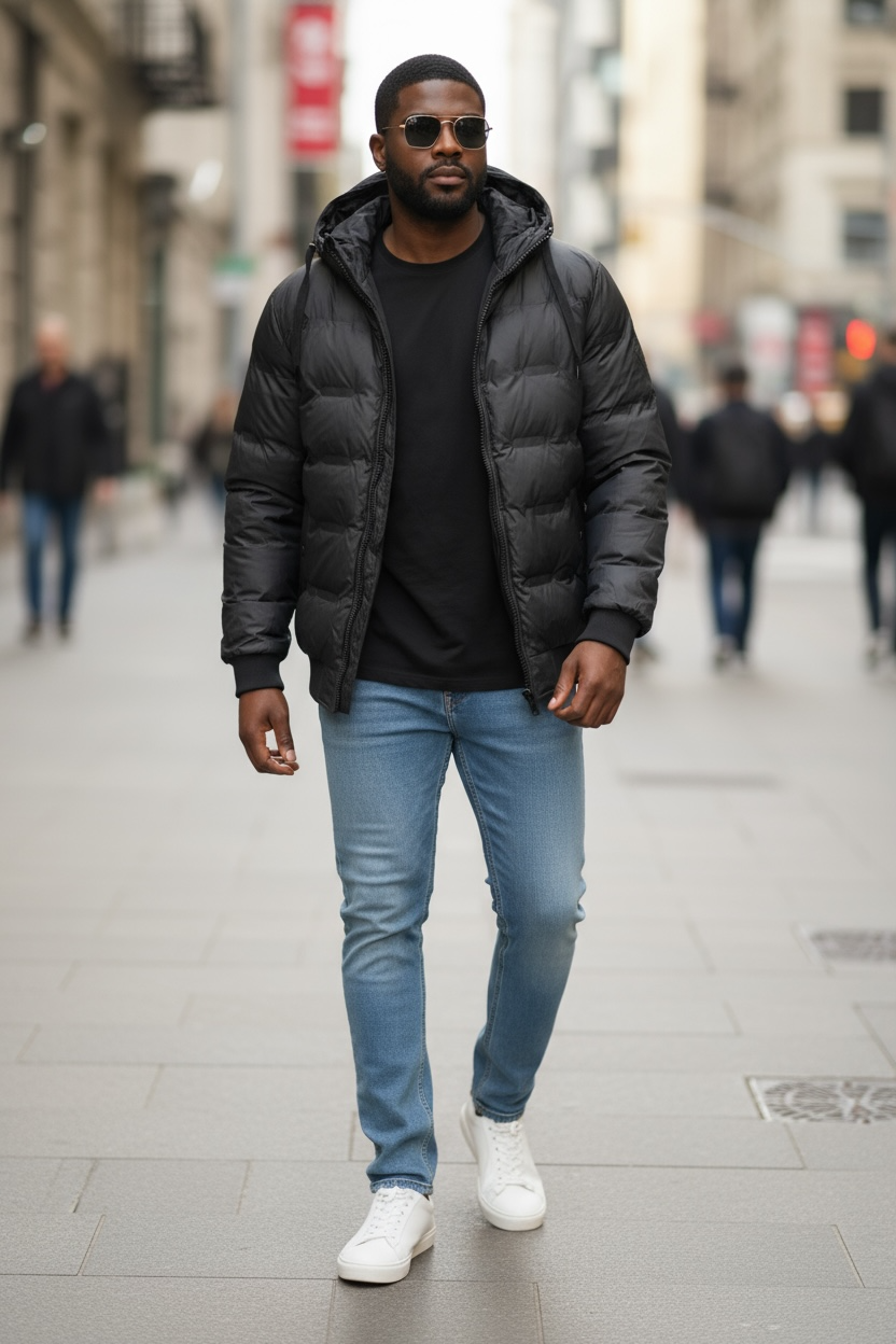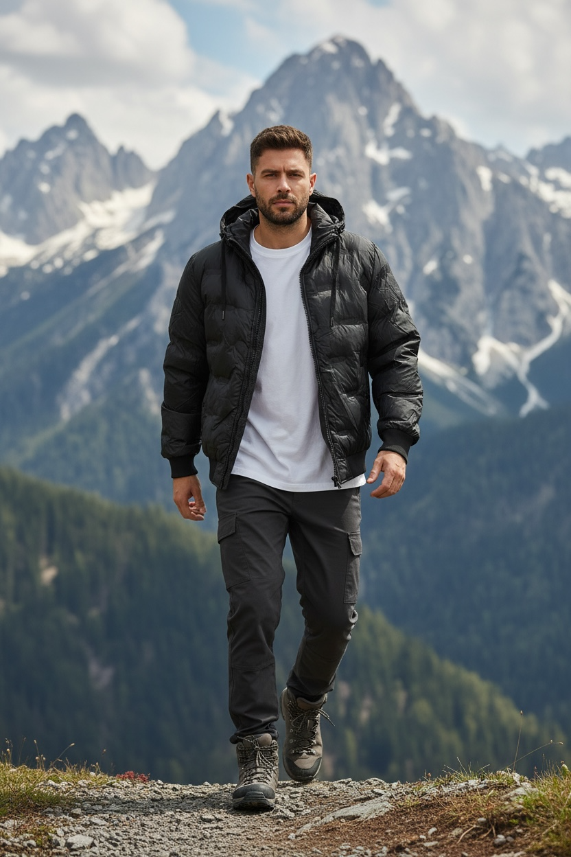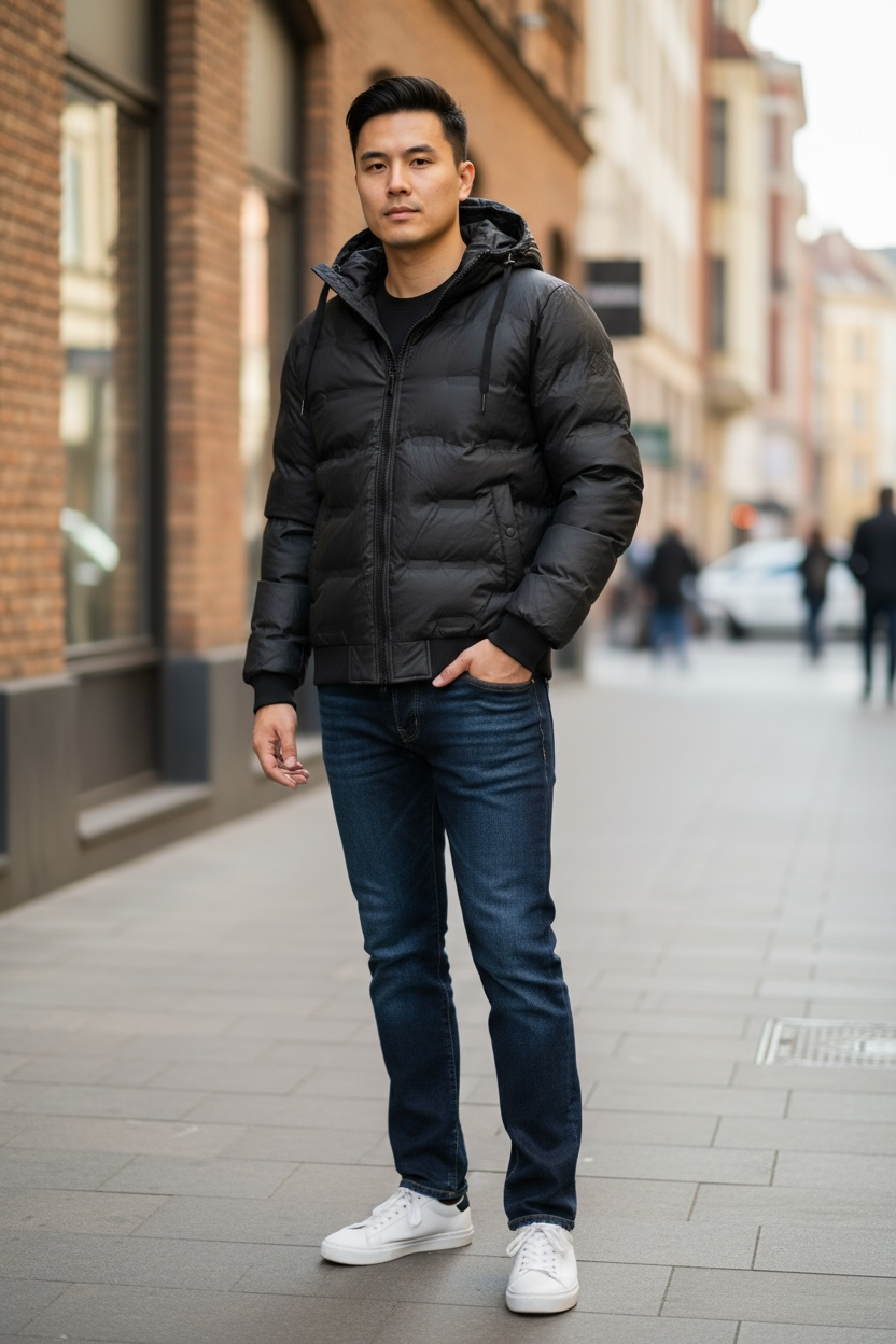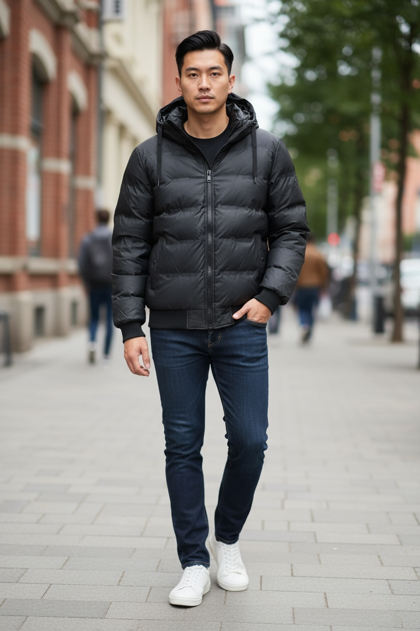 Το μοντέλο είναι 1,77 ύψος και 85 κιλά και φοράει large μπουφάν